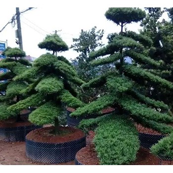 造型罗汉松,别名土杉,罗汉松科,罗汉松属常绿针叶乔木,高达20m,胸径达60cm;树皮灰色或灰褐色,浅纵裂,成薄片状脱落;枝开展或斜展,较密。叶螺旋状着生,条状披针形,微弯。雄球花穗.